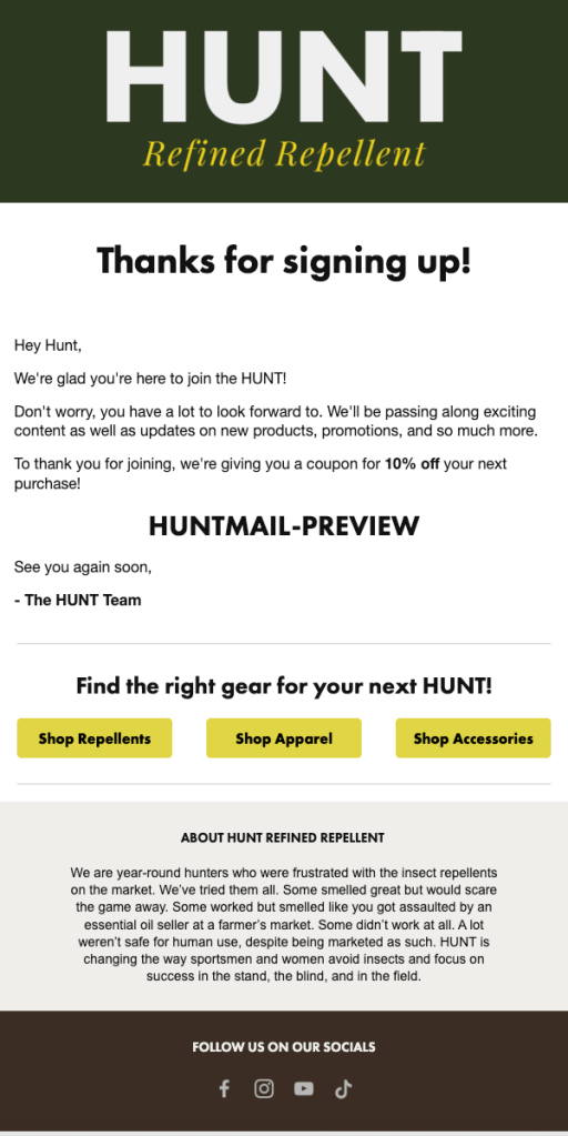At HUNT Tech, I used Klaviyo to design and manage email and SMS marketing campaigns that supported product launches, sales promotions, and ongoing customer engagement. My work combined creative content design with data-driven automation to deliver measurable results.